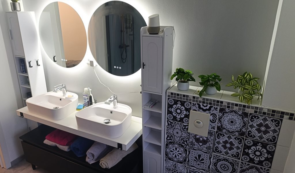 - La chambre est meublée avec une salle de bain partagée avec une autre chambre (mais chacun son miroir, sa vasque et ses meubles)