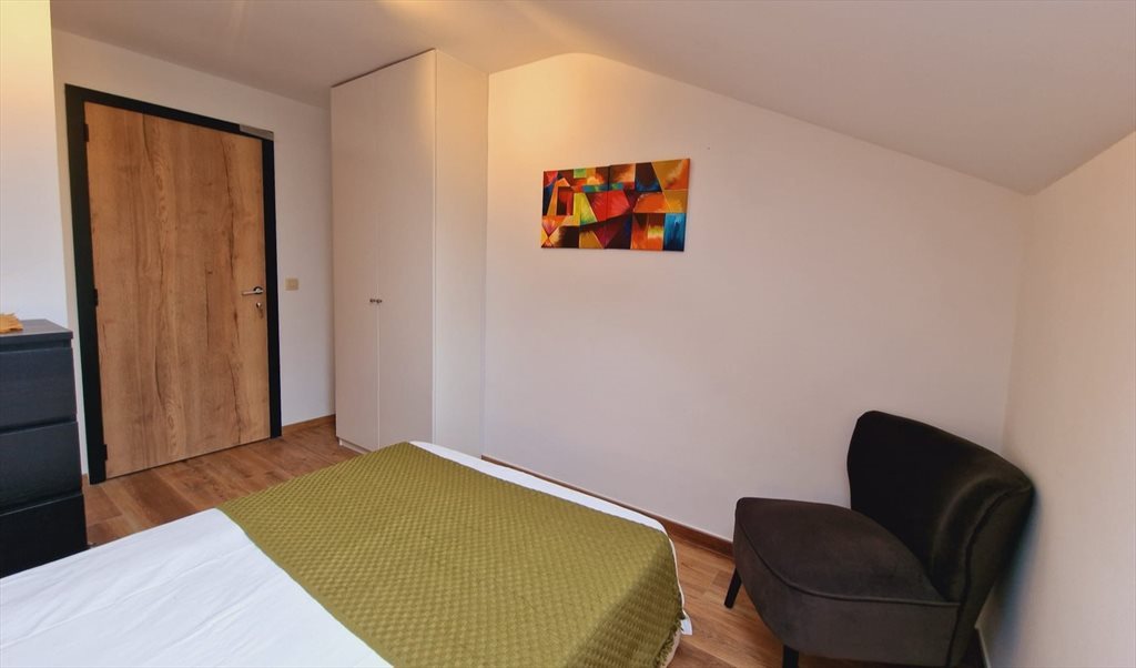 Cette chambre meublée est équipée d'un lit double et d'une garde-robe. La salle de douche avec évier et WC est séparée de la chambre. L'ensemble des parties communes se compose, au 1er étage, d'un hall d'entrée, un vestiaire, une salle à manger, un salon avec balcon, un espace avec 2 bureaux, une cuisine entièrement équipée, une buanderie avec machine à lessiver et sèche-linge, un jardin, une terrasse et 2 places de parking extérieures. PEB C. Le nettoyage hebdomadaire des parties communes est inclus dans le loyer.