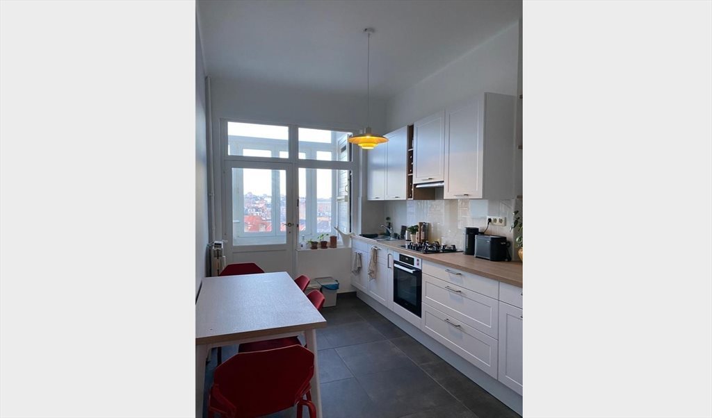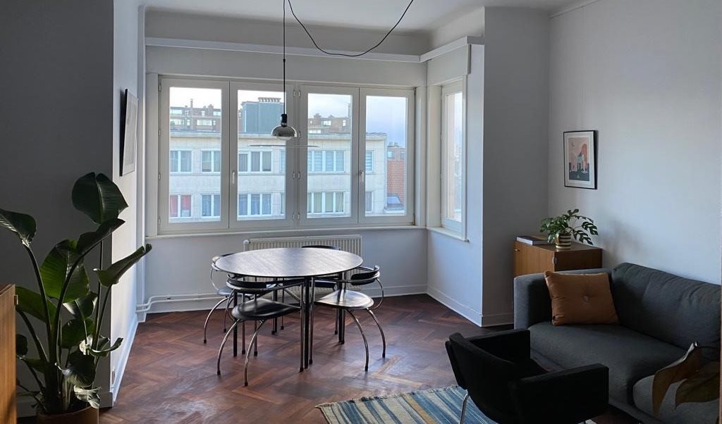 Il est situé au 5 ème étage avec ascenseur d’un immeuble Art-Déco sur l’avenue Charles Woeste à Jette (à côté de Belgica).