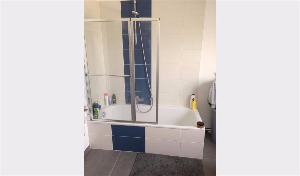 Une salle d'eau avec bain-douche, machine à laver,