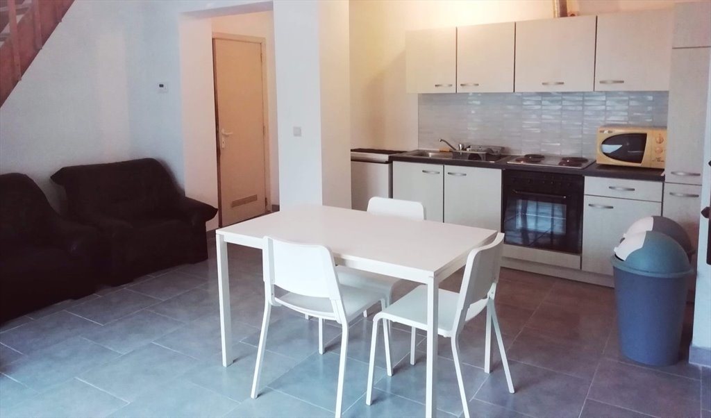 Logements meublés : cuisine équipée, salon, salle à manger, bureau, garde-robe et lit.