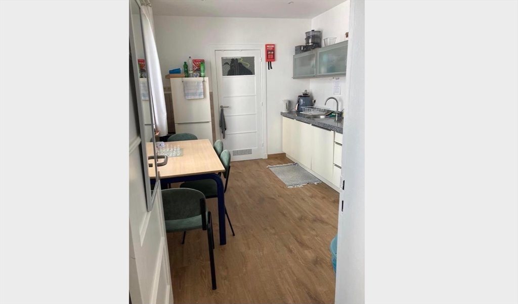 Une cuisine partagée et un séjour avec canapés , une salle de bain à partager à 3 .
