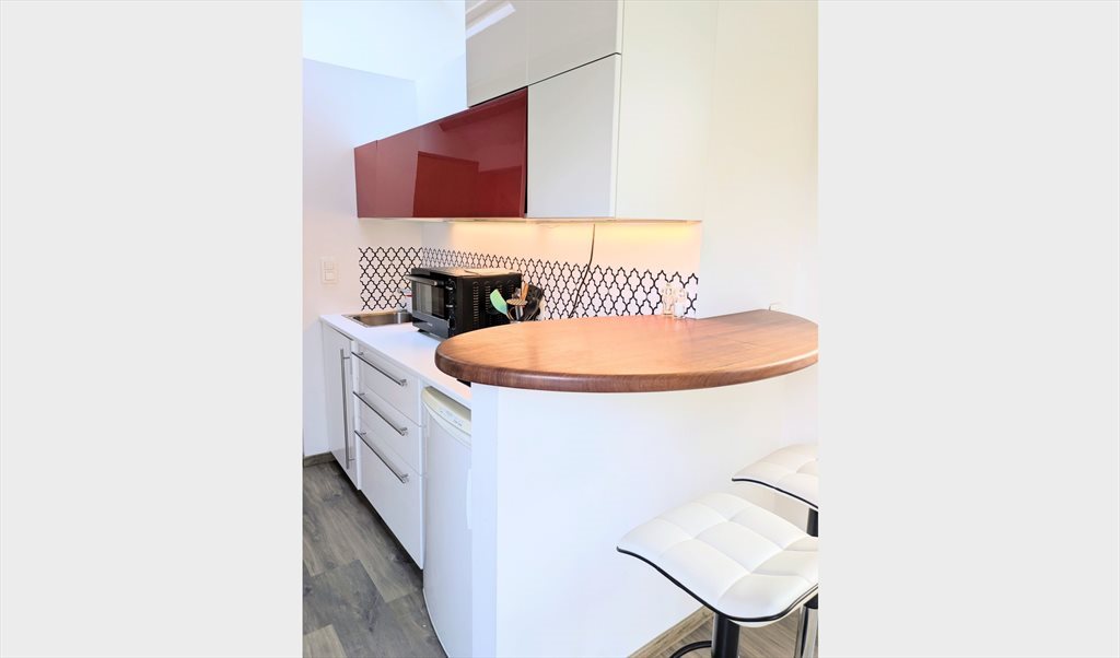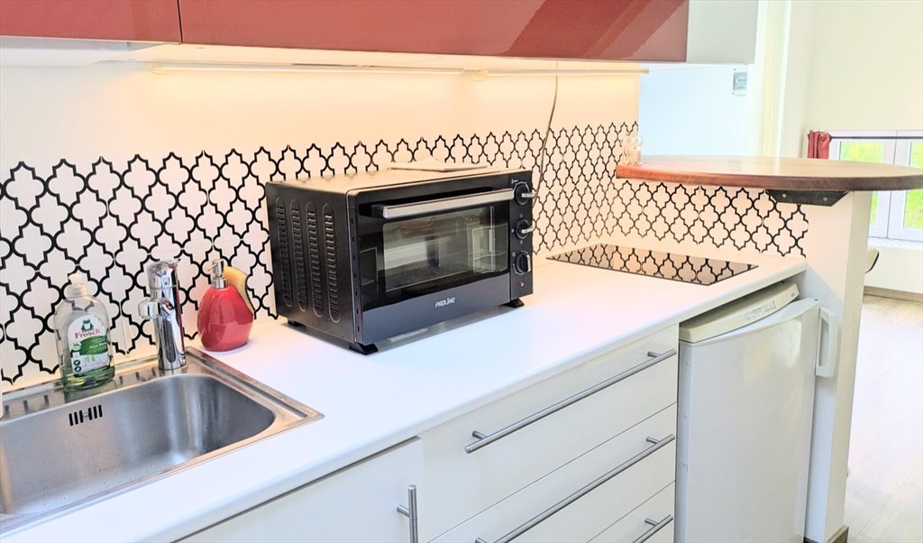 Le studio se compose d'une cuisine équipée (2 taques de cuisson, frigo, four, microondes), d'un WC séparé avec machine à laver, d'un salon avec espace bureau, d'une chambre séparable par un mur amovible, d'un espace dressing, d'une salle de bain avec douche et baignoire, et d'un espace débarras-rangement.