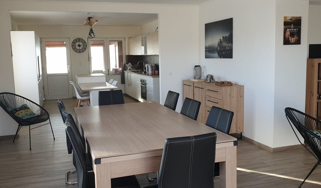 L’espace de vie commun d’environ 60 m² comprend une cuisine complètement équipée (lave-vaisselle, taque à induction, four classique + micro-ondes, 3 grands combinés frigo-congélateur) avec tout le matériel (robot ménager, raclette, pierrade, wok, appareil à fondue, …) pour partager des repas conviviaux dans la salle à manger dont la table se transforme en billard ou table de ping-pong. De nombreux jeux de société sont à disposition et le salon dispose de la télévision (Voo). Le tout est agrémenté d’une agréable véranda. Une buanderie avec lave-linge, sèche-linge, étendoir, fer et planche à repasser complète l’ensemble.