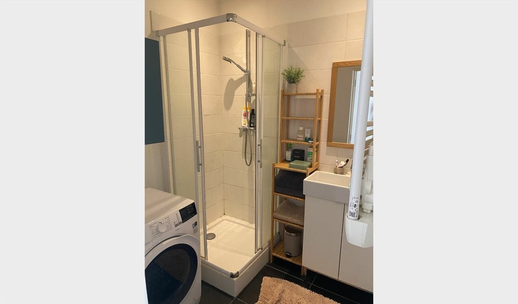 La salle de bain est bien agencée avec une douche moderne, un meuble lavabo et un espace pour machine à laver