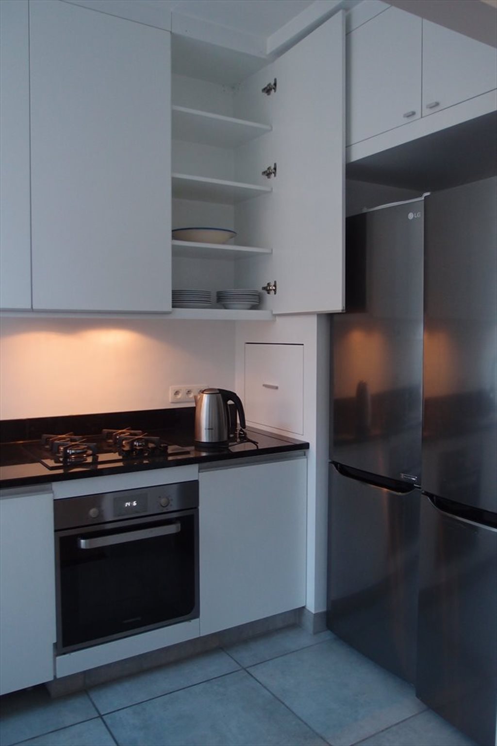 living area with leather sofa and netflixtv, super fully equipped kitchen oven, microwave, dishwasher and two big fridges.