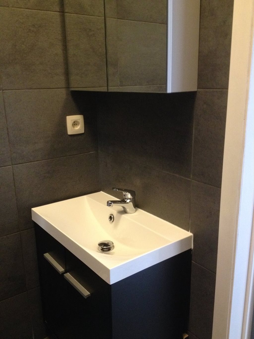 Salle de bain : douche particulière, lavabo, lessiveuse séchante