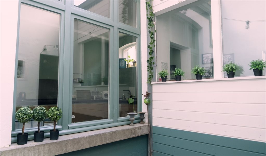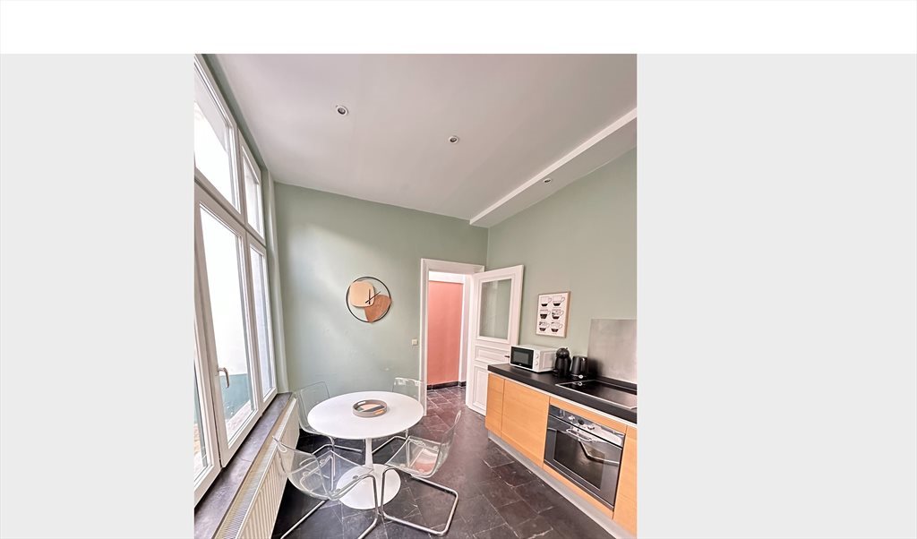 Dans le prolongement, cuisine moderne équipée (table et chaises, lave-vaisselle, four, 2 frigos, taque vitro, machine à café, micro-onde, vaisselle, nombreux rangements, matériel de nettoyage, aspirateur) avec accès sur cour extérieure et WC. Garage à vélos donnant sur la rue.