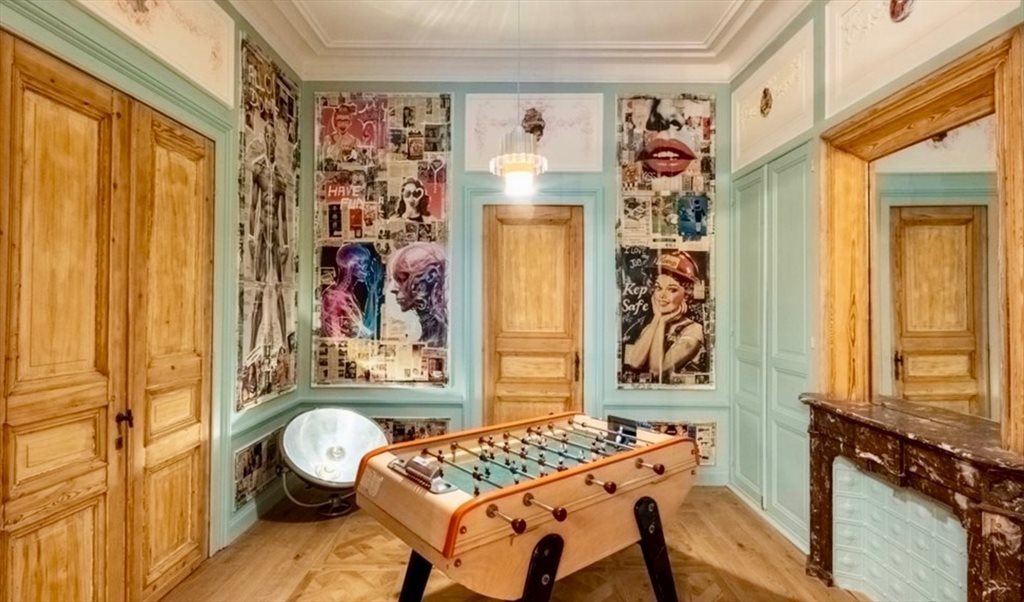 Une salle de jeux avec baby-foot et enceinte musicale,