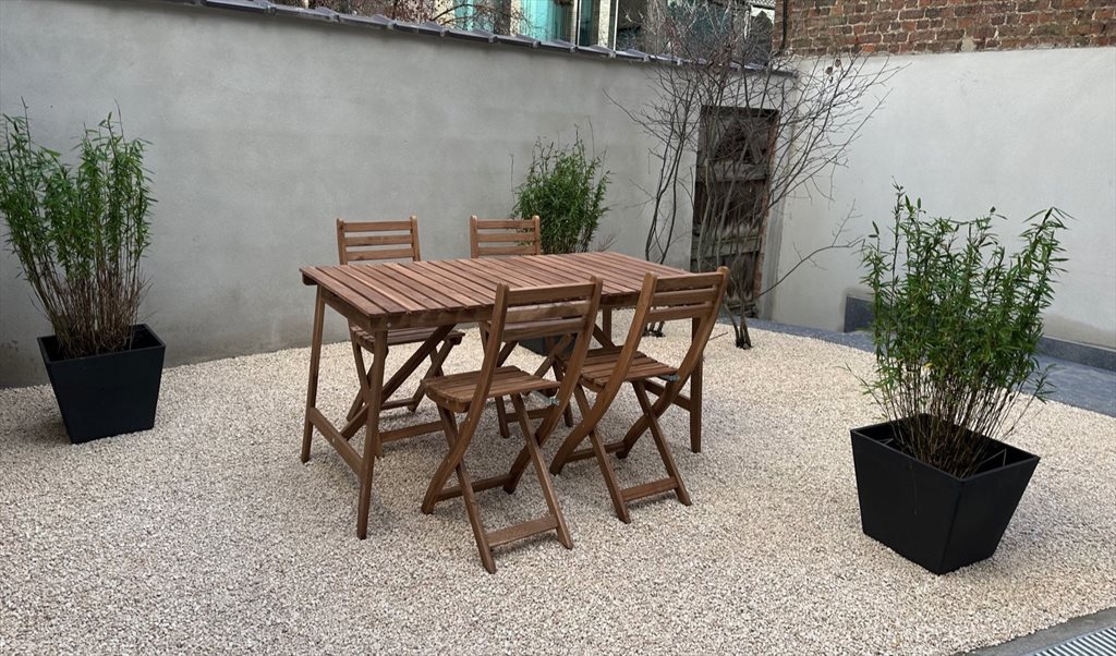 Espaces communs : Une magnifique cuisine entièrement équipée (lave-vaisselle, four, taque de cuisson à induction, micro-ondes, réfrigérateur, congélateur, machine à expresso, bouilloire, grille-pain, assiettes, verres etc...), un îlot central et table à manger, salon avec TV, une buanderie (lave-linge & sèche-linge intégrés dans les placards), un wc visiteur et une agréable belle cour avec une table et des chaises.