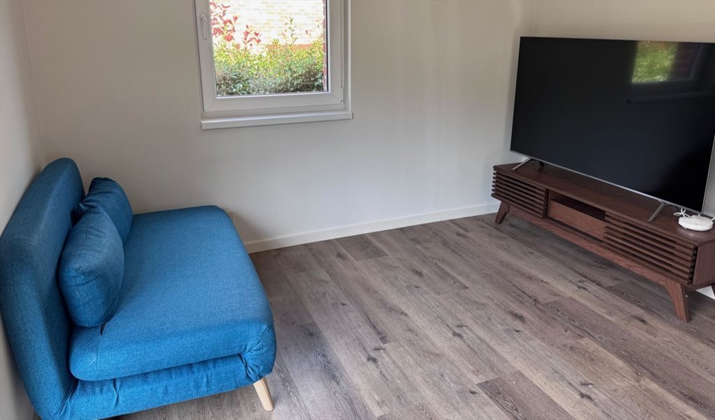 • Un salon comprenant un canapé, table basse et TV ;